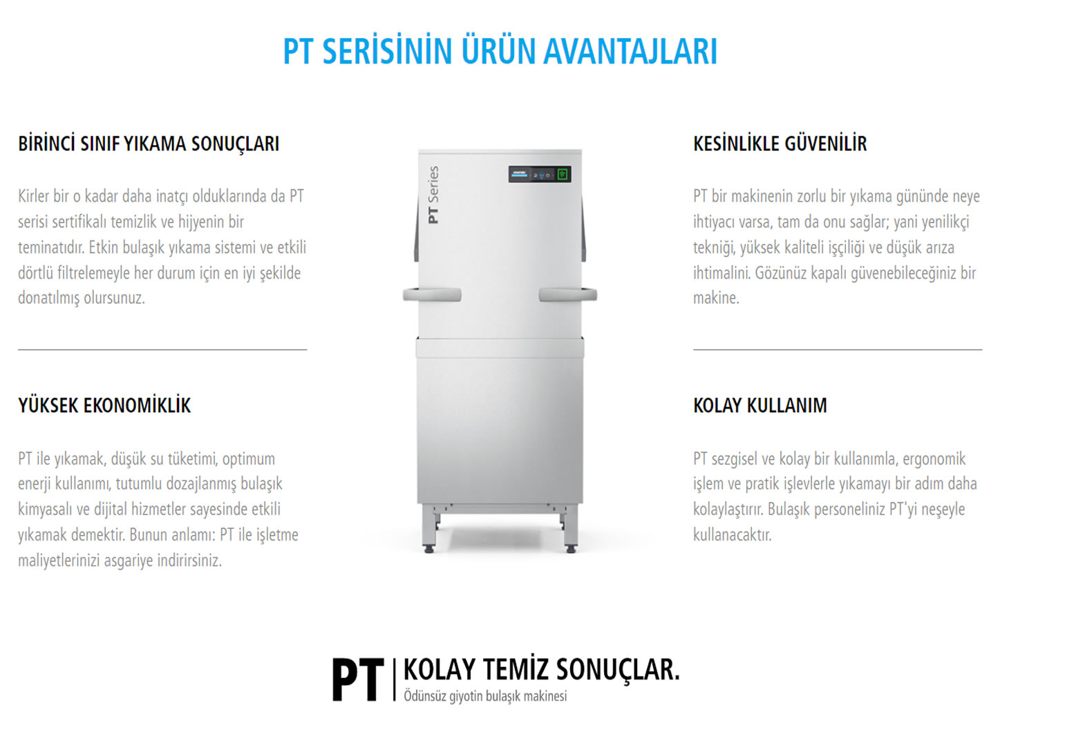 Ne gelirse, yıkayıp atar. Temiz, güvenilir, etkili. Ödünsüz giyotin bulaşık makinesi. İnatçı kirlerin de üstesinden gelir. Ve hemen temiz sonuçlar. Bulaşıkhanede yoğun saatler. Ortasında da Winterhalter'den PT. Giriş tezgahında kirli bulaşık dolu sepetler. Yıkama işlemi başlıyor. Öbür taraftan temiz bulaşık çıkacak. Her şey yürüyor ve birbiriyle optimum derecede uyumlu. Ödün yok. PT serisi bunu mümkün kılıyor. En yüksek gereksinimlere göre tasarlandı ve azami ölçüde ekonomik olmak için ayarlandı. Farklı bulaşıklar için çok yönlü bir cihaz. Basit, etkili, hızlı. Ve her zaman mutlak güvenilir. Iki makine ebadı mevcut. Maksimum çalışma performansı.