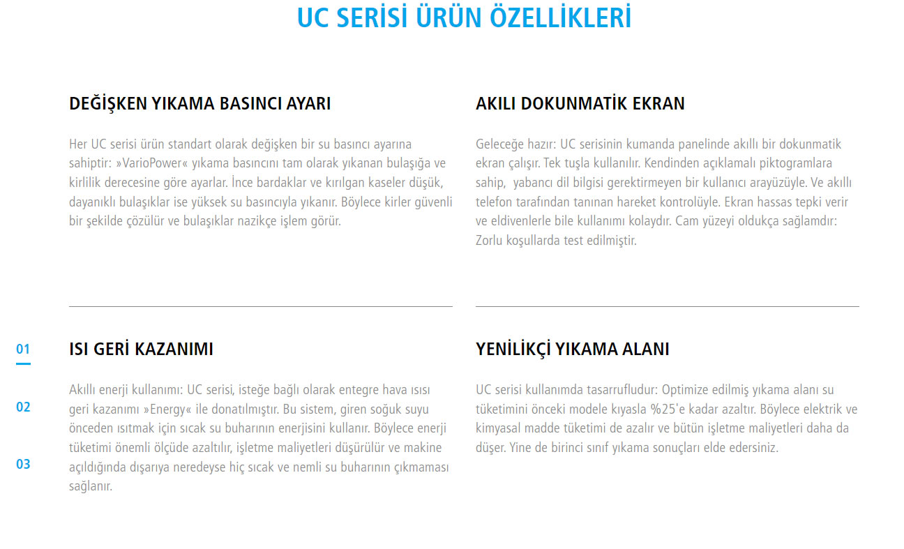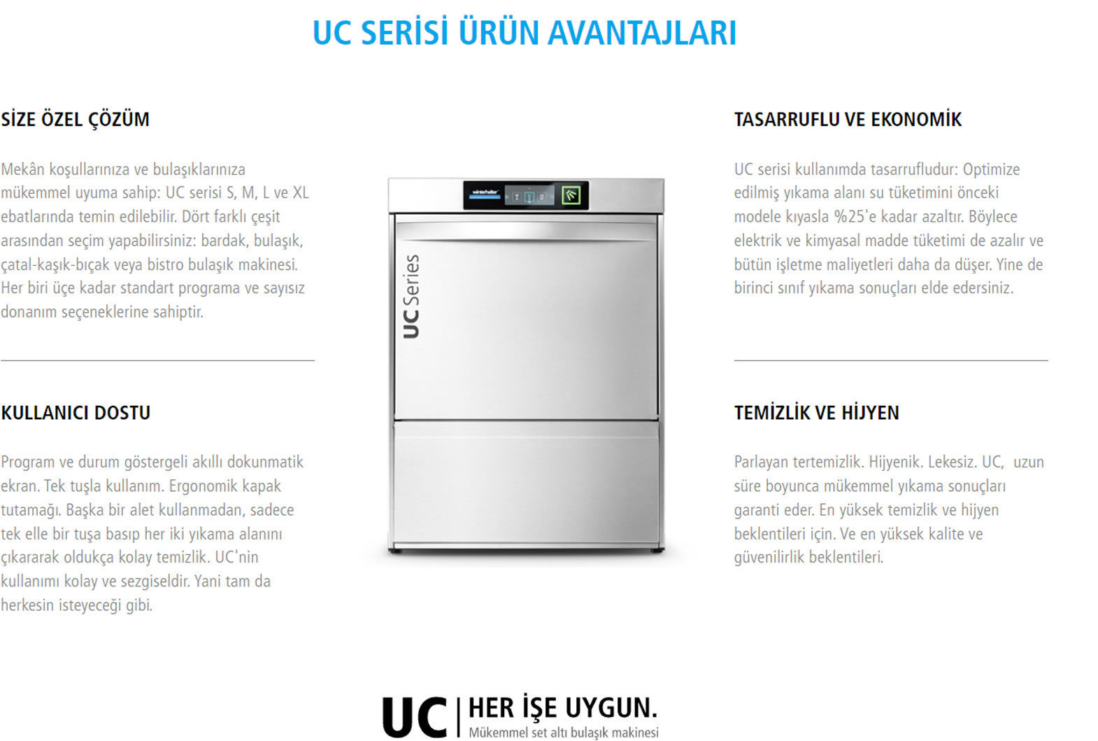 Küçük. Esnek. Güvenilir. Mükemmel setaltı bulaşık makineleri. Bardaklar, bulaşıklar ve çatal-kaşık-bıçaklar için. Hepsi bir yerde.Kullandığınız bulaşıklara özel olarak geliştirilmiştir. Farklı makine ebatları sayesinde kendi mekân koşullarınıza optimum uyum sağlar. Sezgisel kullanımı, tasarruflu işletimi ve yüksek verimliliğiyle etkileyici: Winterhalter UC serisi. Göreviniz parlayan bardaklar, temiz bulaşıklar, lekesiz çatal-kaşık-bıçaklar. Arkasındaki fikir: Tamamen talepleriniz ve ihtiyaçlarınız doğrultusunda. Hangi sektörde olursa olsun. Dünyanın neresinde olursa olsun. Hepsi bir yerde. Sonunda size özel bir çözüm geliştirilecek şekilde yapılandırılır. Rüyalarınızdaki makine.